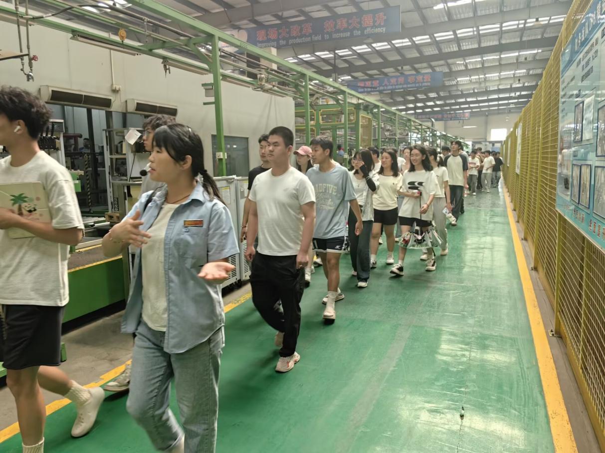 在黄石东贝电器股份有限公司智能制造基地,学生们实地观摩了全球领先的变频压缩机数字化生产线,讲解员系统讲解了永磁同步电机控制技术、智能检测系统等专业知识的工业应用场景,并观看了公司发展历程、目前成就及后续发展规划的视频在东贝制冷有限公司,师生不仅探访了新一代环保冷媒应用实验室,更深入冰淇淋机智能化生产车间,让学生了解课程中“智能制造与节能优化”的理论关联。