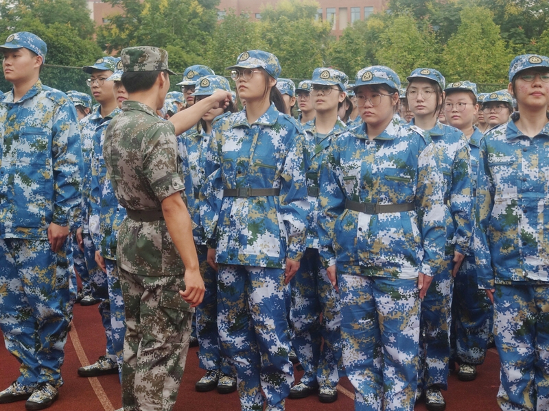 秋季燥热的风拂过肆意的原野,闷热的热浪一波接一波愈发激烈,青年们挺拔的身影在灰蒙蒙天空的映衬下,洋溢着着青春的朝气和新鲜的热血。人文学部七百多名冉冉升起的新星身着迷彩服,身姿挺立端庄,像蓬勃生机的青松札根在红白相间的塑胶跑道,怀揣着对未来生活的希冀,用坚定的意志凝成锐利的长剑劈开眼前的迷雾,无所畏惧,勇往直前。齐步、踏步、下蹲、敬礼、停止间转法……一次次练习,一次次纠错,靠脚声趋向一致,青年意气风发。“一二三四,一二三四”,铿锵的口号在空旷的操场一遍遍回响,从额角慢慢汇聚的汗珠,青年们通红的脸颊,千百次定点的挥臂,遒劲有力的步伐,军训生活让温室里的花朵逐渐脱去了稚气的模样。生于红旗之下,军人血液深入骨髓之中。少年人理应承袭先辈之荣光,无论道阻且长,我心自铿锵。