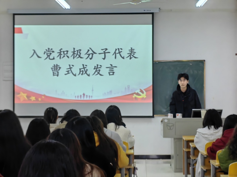 入党积极分子代表曹式成发言,他表示:“十分荣幸能够作为入党积极分子代表参加此次培训班动员大会,希望同学们要把握入党积极分子锻炼的机会,坚持中国共产党的领导,坚定一路跟党走。”