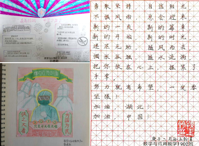 除了以上的抗疫助力外,理工学部团总支、学生会的同学们通过他们的方式为抗疫一线的工作人员加油、鼓劲,为参加志愿者工作的同学们点赞、比心。上交的作品有:书法,绘画,手抄报,歌曲,诗歌等。他们还自觉联合起来,制作了一段为武汉加油的视频。