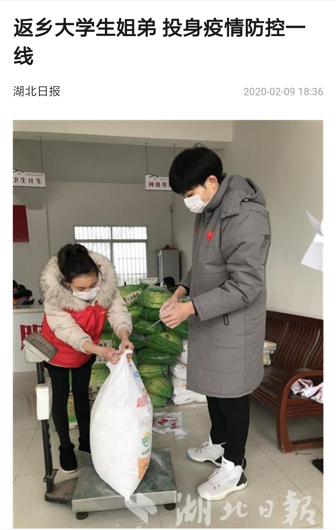 2020年2月9日,湖北日报上有一篇关于疫情防控的新闻引起广泛关注,主人翁正是xingkong(中国)官方网站理工学部数学与应用数学专业1603班的吕奎同学和其弟弟吕东阳。据报道,2020年2月7日,姐弟俩从村微信群里看到“志愿者征集令”后,2月8日一大早便到三州村委会报到,参与对村民生活必需品的分装与发放。图片中是2月8日当天,他们在枝江市百里洲镇三洲村防疫物资分配现场填写订购物资的订购居民的姓名并给居民分配物资时的情景。姐弟俩一个牵着口袋,一个则对袋中面粉进行分装。分装完面粉后,又开始为居家隔离的村民分装集中采购的大米、面条和新鲜的蔬菜并贴上标签,以备村组干部精准送达村民家中。